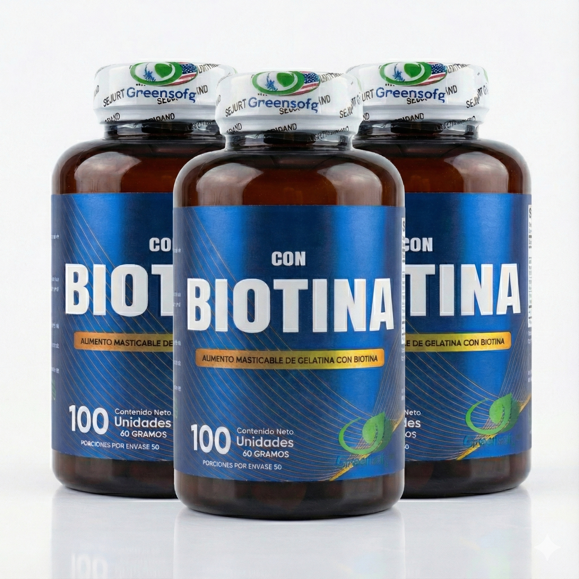 PACK AHORRO X3 Biotina Masticable Greensofg (300 Unidades) – Tratamiento 90 Días para Cabello Anticaída, Uñas Fuertes y Piel Radiante