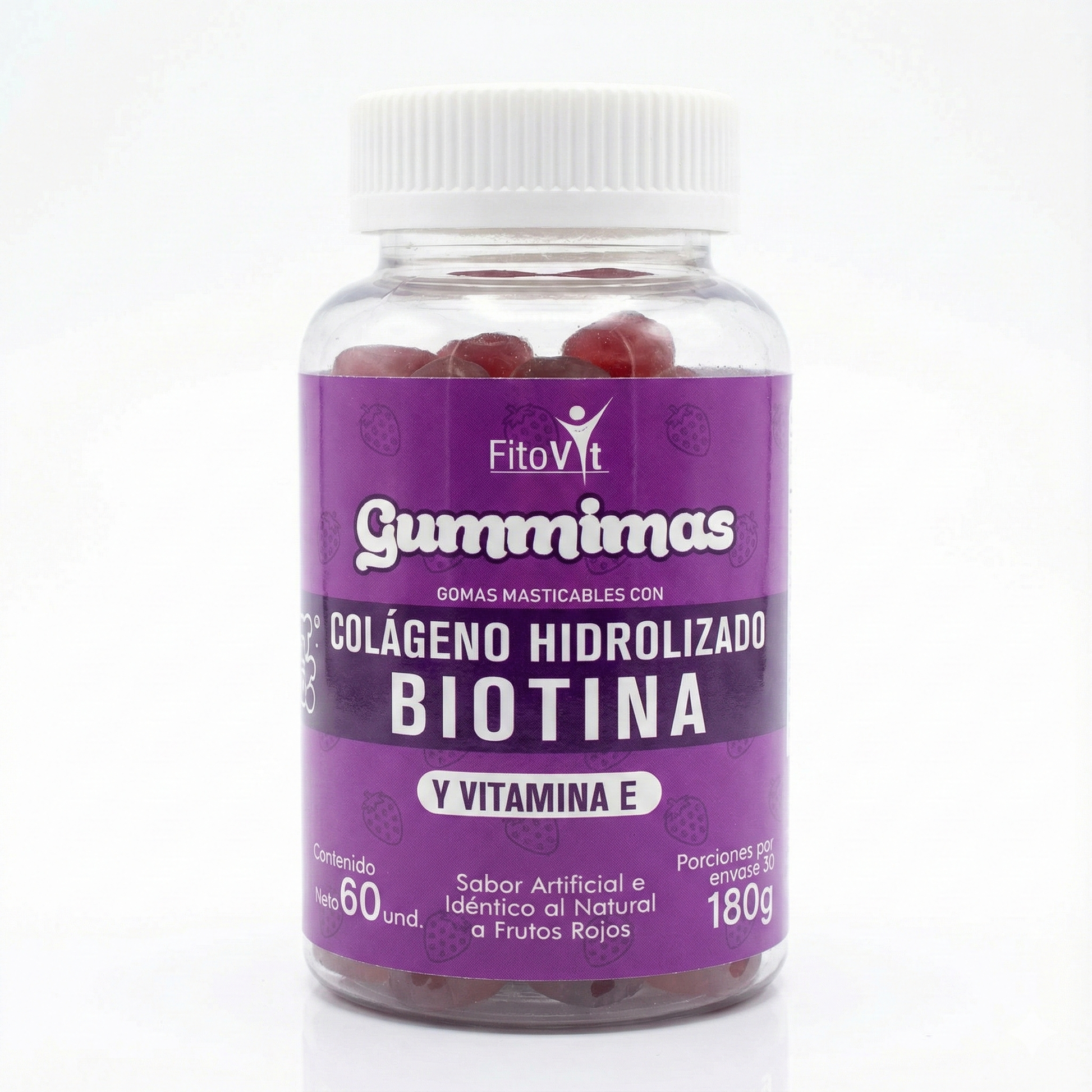 Gomitas Biotina + Colágeno + Vitamina E Fitovit (x60) – Fórmula 3 en 1 para Cabello, Piel Firme y Uñas Fuertes ¡Sabor Frutos Rojos!