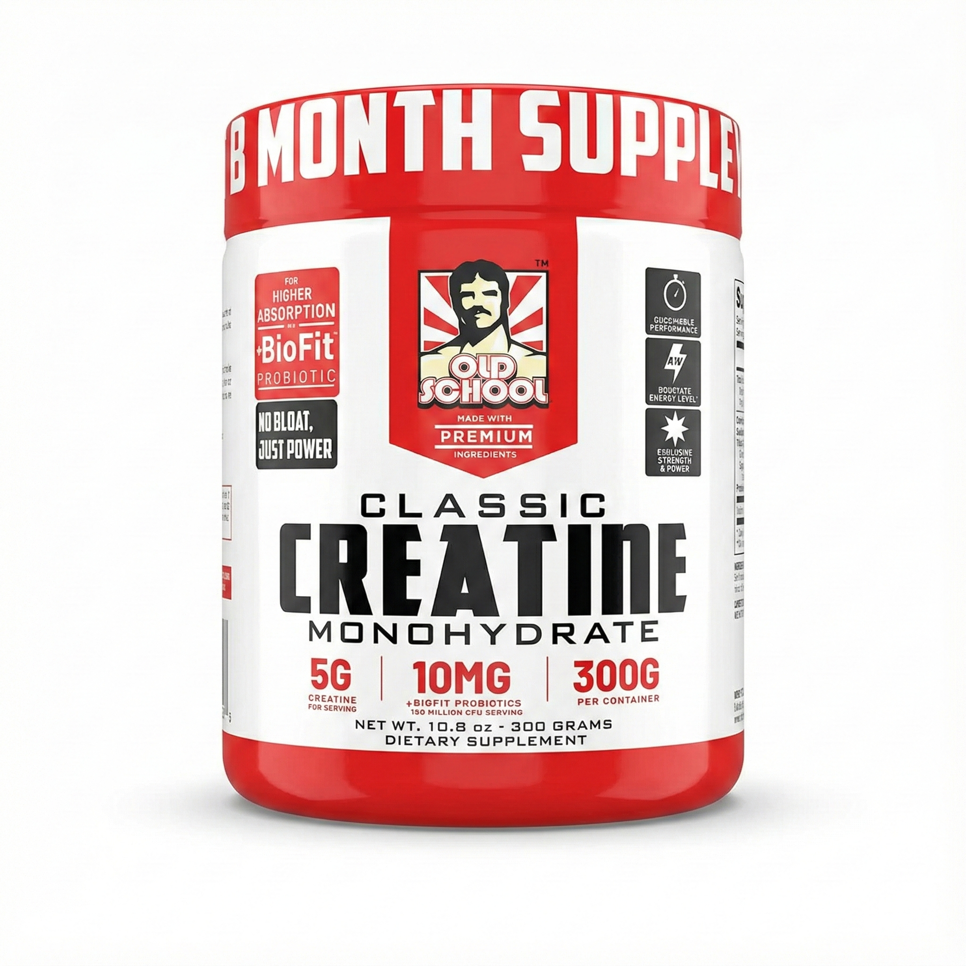 Creatina Monohidratada Pura Old School Classic (300g) – Fuerza, Volumen y Absorción Máxima con Probióticos BioFit®